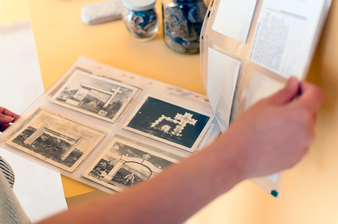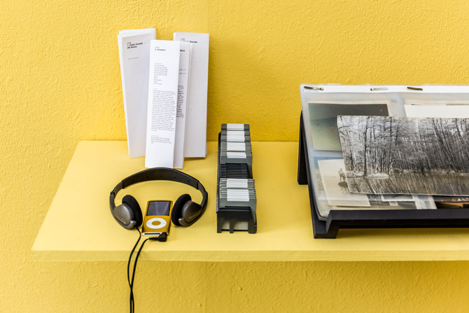 The installation is composed of two posters (digital print on paper); one slide show (on loop on a Kodak slide projector), one photo (digital colour photo printed on photo paper), three collections of stones and beach wood, two folders with photographs and letters, and an audio playlist (headphones, MP3 player and printed text). Photos: 5020/Rauchenbichler